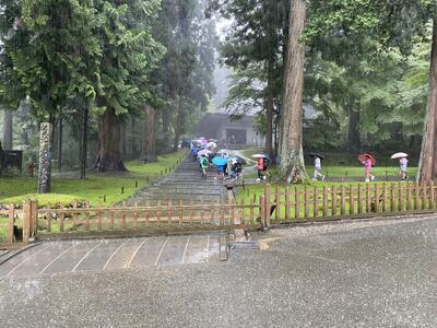 元気に出発しました。最初の見学地は中尊寺。強い雨のため、金色堂のみの見学でした。弾丸中尊寺ツアー。全員無事、月見坂を降りました。バスに戻る頃には、雨がやみました。