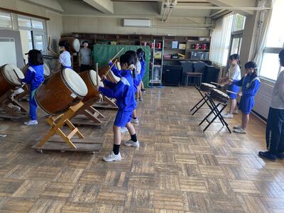 伝承クラブの部員は、休み時間に自分達で練習しています。6年生が上手に教えています。
