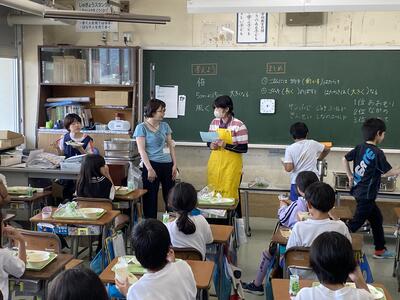 地元の農家の方が給食時間に来校し、生産している農産物のお話を聞きます。生産者の方のお話を聞くことで、農産物に興味をもち、感謝して食べる子どもに育ってほしいです。今日は、三年生の日でした。