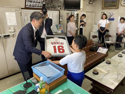 本校児童が、昨年度の菊池雄星 文化プロジェクト 第57回岩手読書感想文コンクールにおいて、菊池雄星特別賞を受賞し、本日、岩手日報さんから、菊池雄星選手の直筆サイン入りユニフォームが贈呈されました。とても、心がほっこりする読書感想文です。第57回岩手読書感想文コンクールのホームページに作品が掲載されていますので、ぜひ読んでみて下さい。(まこが、おねえちゃんになった日! )