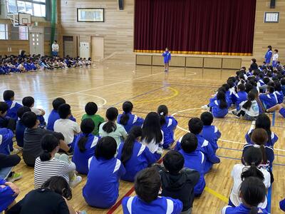 給食後、定期的に全校が体育館に集まり、児童会が進める集会です。落ち着いた雰囲気で集会がスタートしました。放送委員会は、新しい先生方へのインタビュー。生活安全委員会は、安全な生活の仕方クイズをしました。