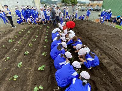 畑の先生 藤澤博見さんを講師に、地域特産の津志田芋とねぎの苗を学校農園に植えました。畑づくり等たくさんの準備もしていただきました。5年生はSDGsについて一年間学習していきます。つながる学びができました。子供達はしっかり話を聞き、丁寧に植えることができました。畑のお世話から収穫の活動を通し、SDGsについて探究していきます。