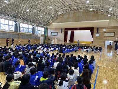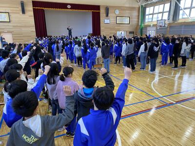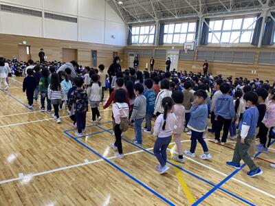 大きな地震を想定した避難訓練を行いました。真剣に行い、整然とした避難行動ができました。まなびフェスト⑧『話を聞く・素早く集合・黙って移動』は、命を守る行動として、日々の学校生活で大切にしています。移動教室も、避難訓練そのものと考えています。
