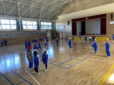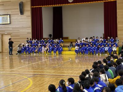 1年生に笑顔を届けようと、各学年工夫して、見前小学校の生活がわかるよう発表しました。1年生も、元気いっぱいの歌でこたえました。新しい体育館中、笑顔が広がりました。