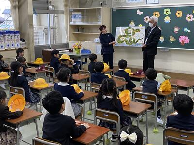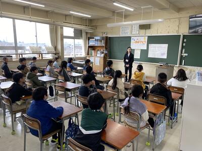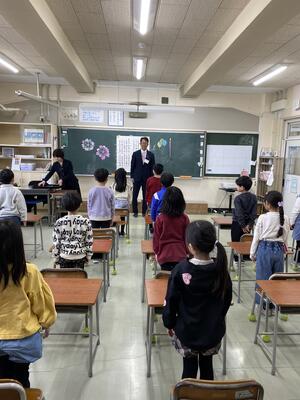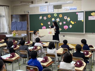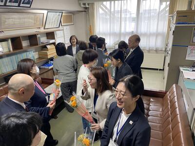 転出、退職する先生方とのお別れの会をオンラインと各教室で行いました。感謝の気持ちが伝わる温かい会となりました。PTA役員とおはなしおなべさんのメンバーもきていただきました。