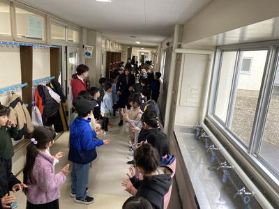 今日から登校する1年生の、朝の準備を支える活動が始まりました。6年生が優しく接するので、1年生は安心して朝の準備をすることができました。