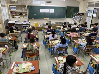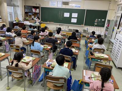先週の簡単給食から始まり、今日からは通常の給食となりました。落ち着いて食べています。1年生が安心して生活できるよう、ボランティアの方々にたくさん支えてもらっています。ありがとうございます。