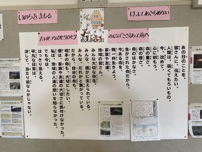 毎日の生活では、命を守るために「まなびフェスト」にも位置づいている「話を聞く」「素早い集合」「無言移動」を大切に教育活動を展開しています。また、様々な教科・領域で復興教育をとり入れた学習をしています。3月11日には、3.11集会を行います。この日は、午前授業ですが、2時46分には学校では哀悼の意を表すために1分間の黙祷をささげます。各家庭でもこの機会に、安全・安心について話し合っていただきたいです。