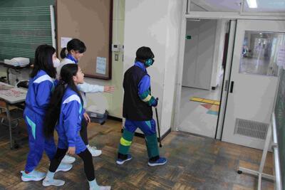 4年生のふるさと学習の大きなテーマは「福祉」です。この日、社会福祉協議会の方を講師に、キャップハンディー学習を行いました。