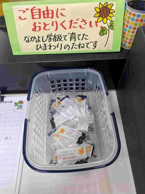 なかよし学級では、なかよし農園でいろいろな野菜を育てました。今年もいい野菜ができ、職員室に売りに来ました。立派に育った大根です。ひまわりの種も袋に入れ、正面玄関に置いています。来校した際は、どうぞお持ち帰りください。